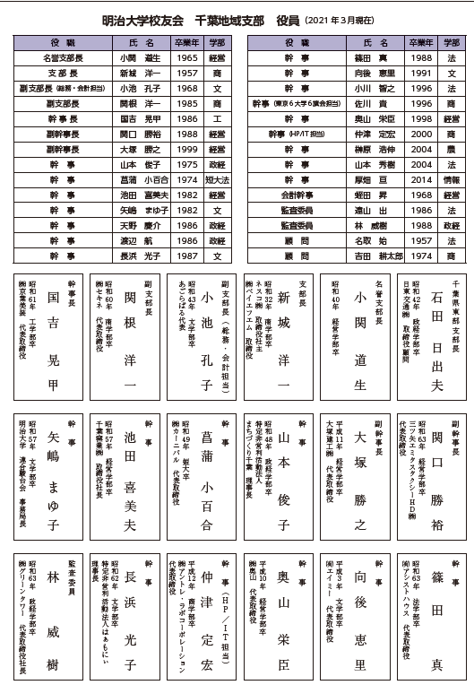 - その他、明治大学公開講座の開催・マンドリンクラブ演奏会などを通した地域社会への貢献。千葉県東部支部の事務局地域支部として当該支部活動支援。